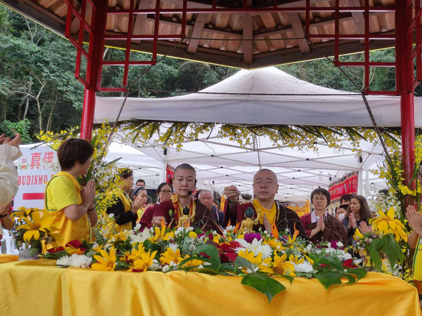 1996年4⽉20⽇,經真諦同⾨⿑⼼努⼒⾄誠邀請,終於迎來了真佛宗創辦⼈蓮⽣活佛蒞臨巴⻄弘法。聖尊的到來使真佛密法在巴⻄⼤放異彩,舉辦的「⿈財神增益護摩」、「阿彌陀佛息災、祈福、超度、治病⼤法會」兩場法會,盛況空前,在巴⻄及整個僑界產⽣了轟動效應。法會結束後師尊應邀與真諦堂的弟⼦們暢遊亞⾺遜原始森林,融⼊在⼤⾃然中,師佛寫下了「與⼤⾃然交談」⼀書,為真諦雷藏寺發展史上寫下了最光輝的⼀⾴。